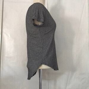 Features: front left pocket, Hi-Lo style, black & white Stripes, scoop neckline, short sleeve shirt, tee, top,