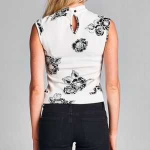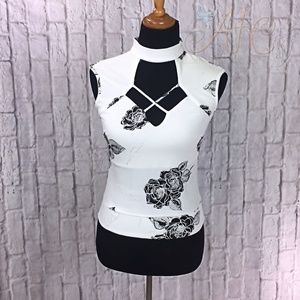 Route 3 White choker top with black floral foil details. Features a key hole back and open chest, and sleeveless.