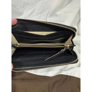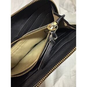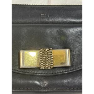 Overall fair condition. Minor tarnishing on hardware. Soft black leather. Ziooer works great. A little dirty on coin compartment. Love the "bow"