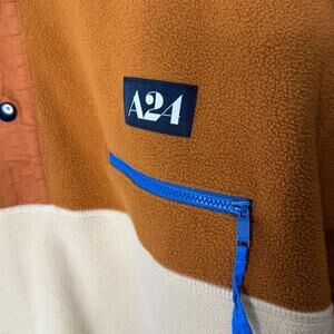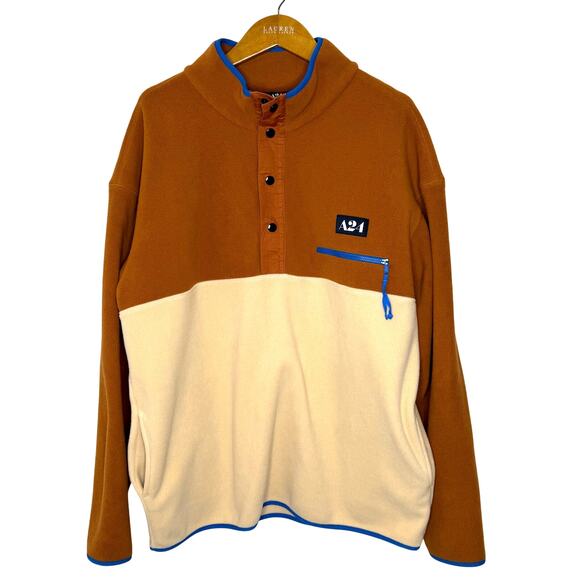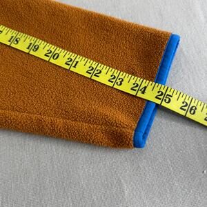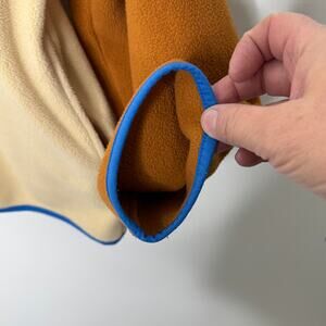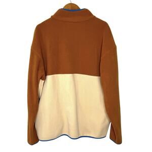 Cut-and-sew pullover fleece with pockets on side and left side chest. Blue piping on collar, cuffs, and bottom.
