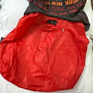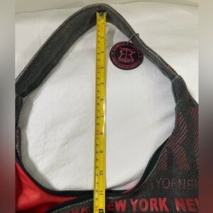 Brand new Robin Ruth hobo shoulder bag featuring an allover “NEW YORK” text print in orange, beige, and coral tones. Designed with a relaxed slouchy silhouette, single shoulder strap, and bold red interior lining. Lightweight and roomy — perfect for everyday wear, travel, or adding a pop of city style to your look.