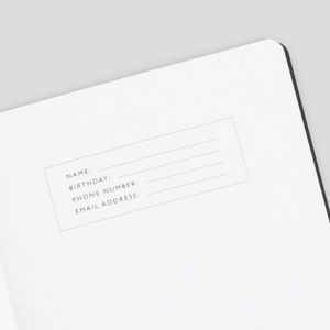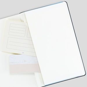 -Soft touch film cover with elastic closure and bookmark ribbon. An expandable inner pocket contains a sticker