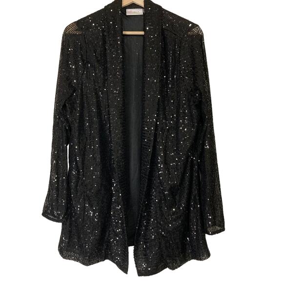 Features: allover sequins, long sleeves, open front, shawl collar, straight bottom hem