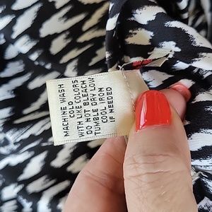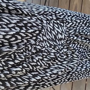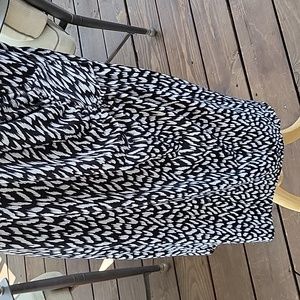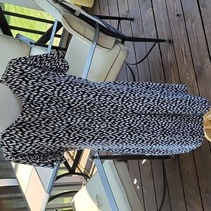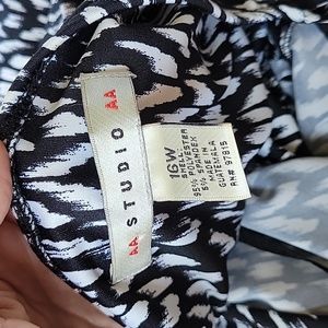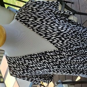Size 16w, black and white dress. faux wrap around look. stretchy material. chest 41", waist 37", length 41". gently worn and in great condition.