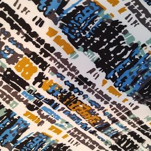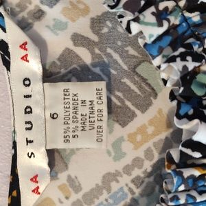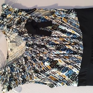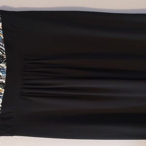 Sleeveless dress has printed design on top and solid color black bottom. Ruffled collar and bow on front. Bottom is pleated below the waist band. Lightweight and stretchy polyester and spandex. Gently used in excellent condition.