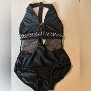 AA dance design costume solo custom black mesh cutout rhinestone mature adult XS