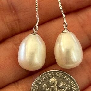 AAA White Cultured Oval Pearl Dangle Earrings - 925 Silver - 2 1/2 Inches