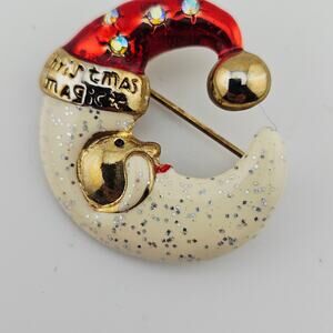 AAI Santa Hat Moon Brooch Pin Christmas Magic Celestial Glitter Enamel Vintage