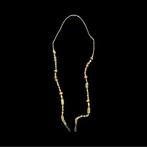 Elegant beaded eyeglass chain featuring gold and brown accents. Perfect for adding a touch of sophistication to any outfit.