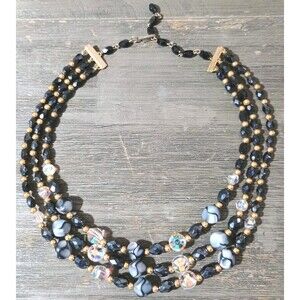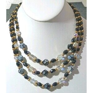 AB Crystal Black Glass Gold Tone Beaded Vintage Collar Triple Strand Necklace