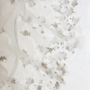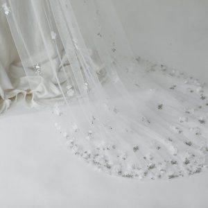 Gorgeous wedding veil with crystals and Light ivory English tulle. Organza blooms with silver and opal detail subtly climb up the veil from concentrated clusters at the bottom.