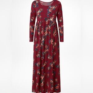 Elegant and versatile, this deep burgundy maxi dress features a stunning allover rose floral print in shades of coral, ivory, and blue. Made with a soft, stretchy fabric for all-day comfort and flattering drape, it's perfect for both casual outings and dressed-up evenings. The long sleeves and empire waist provide a chic, feminine silhouette.