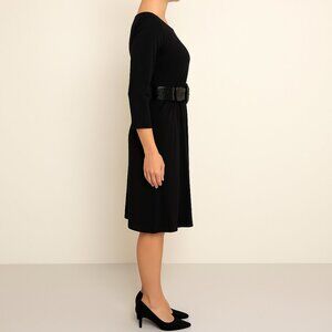 Chic, classic, and flattering — this AB Studio black dress is a timeless wardrobe essential. The 3/4 sleeve design and belted waist create a sleek, hourglass silhouette that’s perfect for both work and evening occasions. The soft, stretch fabric drapes beautifully, offering comfort without sacrificing style.