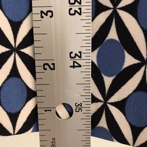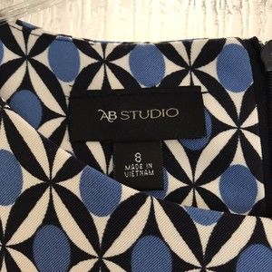 AB Studio Blue Geometric Print Sleeveless Sheath Dress Size 8. Approximately 35 inches from shoulder to hem. Excellent condition. This is a very versatile dress that can be dressed up or down and take you through several seasons. It is equally appropriate for work as it is for a spring time wedding. You could also add a blazer or cardigan to take you into fall weather.