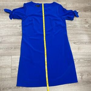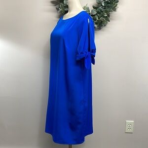 AB Studio Cobalt Blue Shift Dress Cold Shoulder Tie Sleeves Pockets in size 10. Excellent like new condition. Body is lined, short sleeves with cold shoulder and tie details, two side pockets, hidden back zipper closure. Please see photos for approximate measurements and details. Item may show difference in color based upon photography and perception. Photos are part of the description, as everyone’s level of condition may vary. From smoke free and pet free home. All packages are shipped the same or next business day.