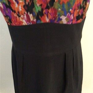 Vibrant floral top with a classic black skirt. Ideal for stylish outings.