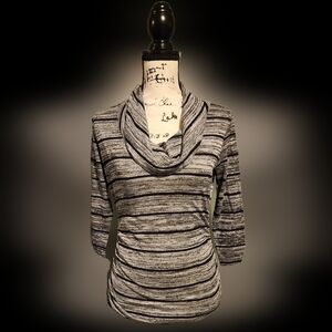 Striped cowl neck top with 3/4 sleeves and side ruching. T-16