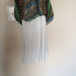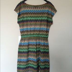 This is the cutest dress with a super fun zig-zag pattern in an array of warm fall colors! The dress has an attached cream slip and sleeves that sit on the edge of your shoulder.