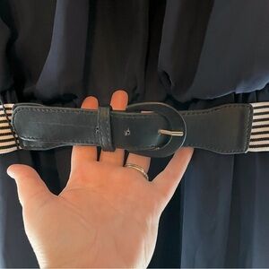 New with tags AB Studio Navy Blue Blouson Dress with white and navy elastic belt, leather buckle closure. Can be removed from dress