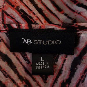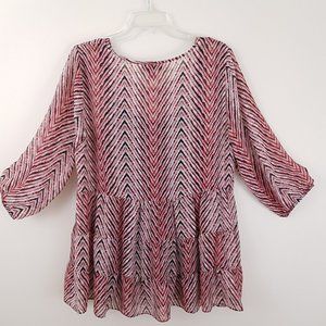 ECU no flaws, AB Studio Ruffled Semi-Sheer Tunic Top w/ Black Cami. Orange, Cream, and Black Chevron Print. 100% Polyester.
