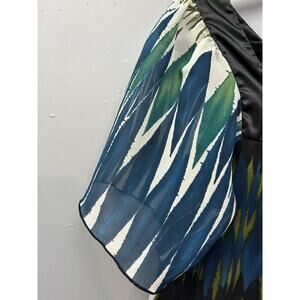 AB Studio Shirt Womens Large Blue Green Black Ikat Print Short Sleeve Satin Trim Top