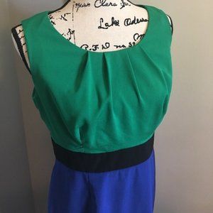 AB Studio Sleeveless block color dress size 10, green top, black waistband, blue skirt.