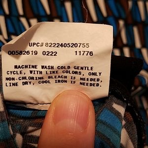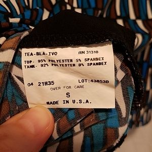 Blue, brown and ivory on black with black camisole front under wrap front.