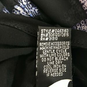 This AB Studio blouse is pre-owned but in excellent condition, showing no signs of stains, tears, or flaws. It features a stylish black and blue chevron stripe pattern and comfortable 3/4 sleeves, perfect for adding a touch of elegance to your wardrobe.
