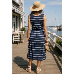 This charming navy striped sleeveless dress by AB Studio is your effortless ticket to breezy chic. Featuring a flattering cowl neckline and softly elasticized waist, this piece flows with easy sophistication. The knit fabric blend of polyester, rayon, and spandex delivers a comfortable drape that moves with you from sun-drenched strolls to al fresco evenings. Pair it with wedges and a woven clutch for a timeless look that channels resort elegance with a modern twist. This dress is in mint condition and ready to sail into your wardrobe.