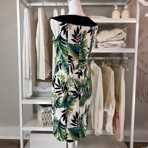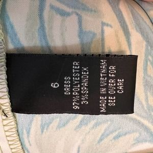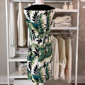 AB Studio bold Leaf pattern Midi dress. Retro 60's style. Sz. 6. #0452. Green and teal with black on white background. Back zipper closure. Good stretch material