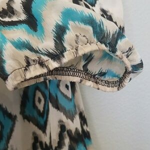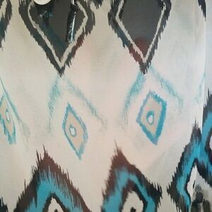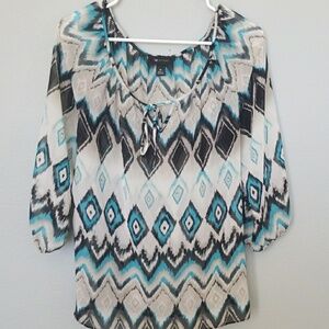 Sheer top with elastic on each end of arm. Approx elbow length sleeves. Ties at the neck can be worn tied or untied. Geometric / tribal / southwest pattern. Cream with hints of turquoise and black. Dress it up for work or wear it more casual for the weekend. office, workplace, neutral, brunch,