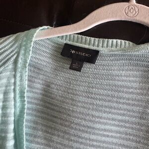 Stay cozy and stylish with this light mint shrug sweater. Perfect for layering, this piece adds a touch of elegance to any outfit. Pit to pit width is 19 inches and length is 21 inches. Cotton, rayon, nylon. EUC