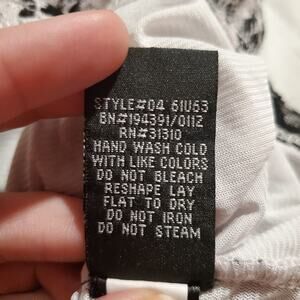 Ab studio small white and black floral short sleeve blouse. Top is 92% nylon and 8% spandex. Lining is 100% polyester. Measurements are included in photoa.