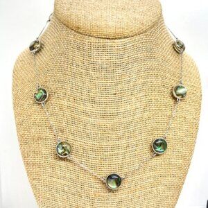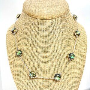 Beautiful ABALONE MOTHER OF PEARL STATION NECKLACE crafted in genuine sterling silver (925). Features eight bezel-set domed, round abalone shell stations with iridescent ocean hues of green, blue, and gold, each piece naturally unique and glowing with depth and color. Measures approximately 18" long with a secure lobster clasp stamped 925 VS, abalone circles: .5" around. Lightweight yet striking, this necklace layers beautifully with other chains or stands out worn alone. Excellent pre-owned condition with minimal wear consistent with gentle use. A timeless and elegant sterling silver abalone necklace that adds the perfect touch of shimmer and sophistication to any look.