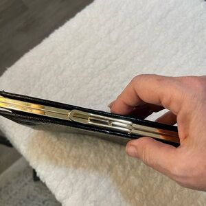 This sophisticated black clutch features a stylish crocodile-embossed design, perfect for any occasion. Its sleek and elegant look makes it a must-have accessory.