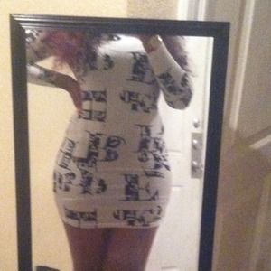 Long sleeved white mini body-con dress with black alphabets! Super cute worn once on my birthday the material is very stretchy and somewhat see thru.