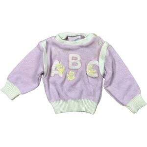 Vintage baby sweater in soft lavender with white contrast trim, featuring large embroidered “ABC” letters and pastel cats. Some faint discoloration on the chest. Fairly good condition.