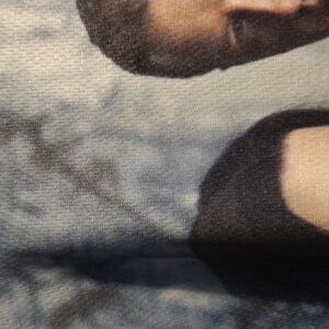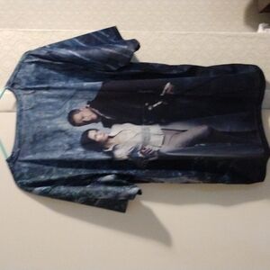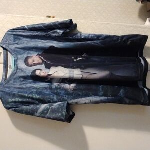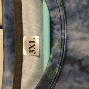 Size 3XL. Material feels like rayon or viscose blend with a sports weave mesh. 23 1/2" across laid flat armpit to armpit. 30" long.
