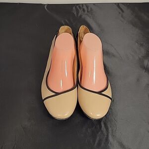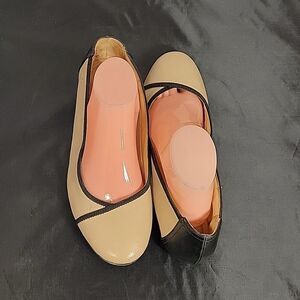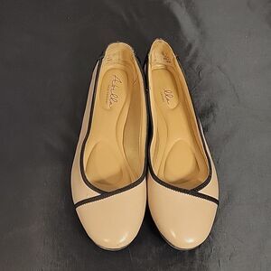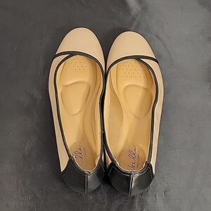 ABELLA TRUE COMFORT SLIP-ON WOMEN"S ROUND TOE LEATHER WITH BLACK LINE EMBELLISHMENTS FLAT SHOE SIZE 11M COLOR CREAM AND BLACK MADE WITH ALL MAN MADE MATERIALS Featuring a classic design, the Prima ballet flat from Abella will pair with anything in your wardrobe. This slip-on is finished with a True Comfort footbed to offer all the support you need FEATURES Faux leather upper Slip-on under toe with moisture-wicking perforations