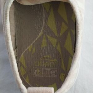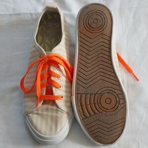 Beige and tan sneakers with orange shoe strings. There's some smudges on both tongues and a couple of spots as shown.