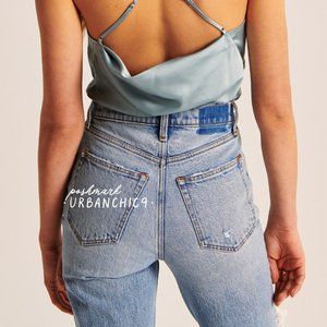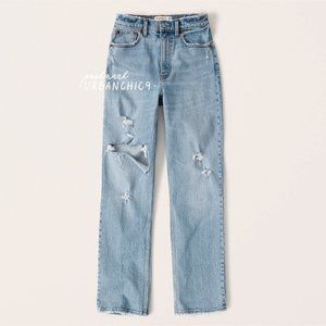 ABERCROMBIE 90s Ultra High Rise Straight Jean Distressed Ripped Knee Medium Light Blue Wash size 24 REGULAR NEW WITH TAG. Price firm. Super high rise. Fits straight. Flattering cut. Beautiful wash & distress. Vintage feel denim. Low stretch. Length is good for tall. True to size. Apprx measurements: Waist 25" Hips 35" Front rise 11.25" Across thigh 10.25" Inseam 30" #589