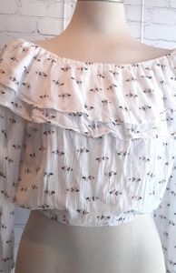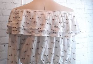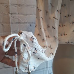 Gently used preowned no visible flaws or wearing double ruffles, and elastic on the waist with a beautiful detail cord on each end sleeve