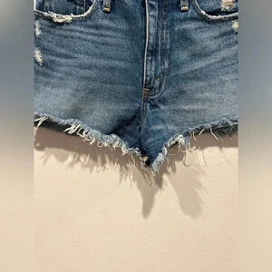 Annie high rise shorts / mid color wash with distressing / raw hem