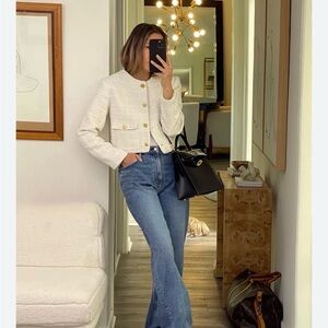 • Creamy white color. Gold buttons with a regal inspired design. Cropped. Tweed. Textured. Lined. Pockets.