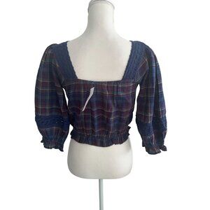 ABERCROMBIE & FITCH Navy Blue Plaid Peasant Top Size Small NEW NWT