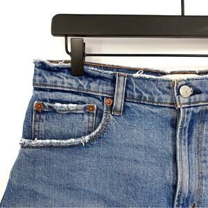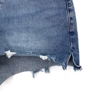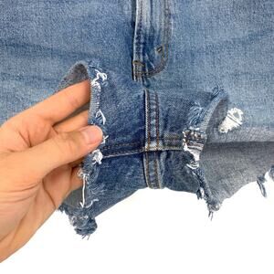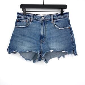 Abercrombie & Fitch The Cutoff Short, High Rise Jean Shorts in a medium blue wash denim. Zipper fly, slightly stretchy, raw gems, distressed spots throughout. Great basic short!