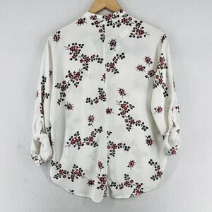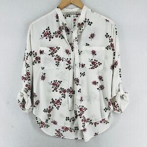 ABERCROMBIE & FITCH Top XS Floral Poplin Tie Neck Blouse Roll Tab Sleeve White