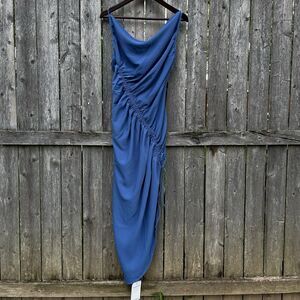 Slim-fitting midi dress in our soft faux silk fabric and body-skimming fit, featuring asymmetrical cinched detail across the bodice, adjustable straps. New with tags, absolutely no flaws, never worn.