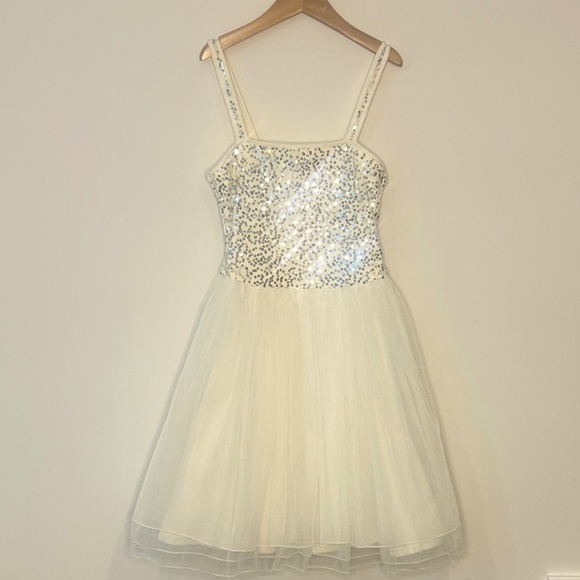 Delicate ivory party/occasion dress from Abercrombie. Soft stretch cotton lining with sequined bodice, shoulder straps and full tulle skirt. Abercrombie Kids size L (approx age 12-14). Perfect for the holidays.