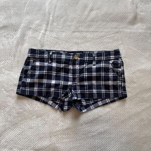 🍯 - Navy and white plaid print with side button detail, faux back pockets, and signature Abercrombie moose embroidery on the front. Soft cotton feel — perfect for preppy summer fits or Y2K throwbacks.